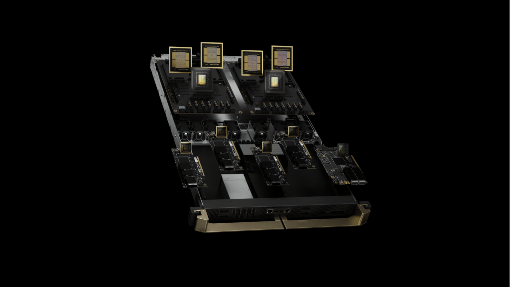 De acordo com a apresentação de Jensen, as GPUs da arquitetura Blackwell são “o motor para impulsionar essa nova revolução industrial”. Elas contêm 208 bilhões de transistores e são fabricadas usando um processo TSMC 4NP personalizado.