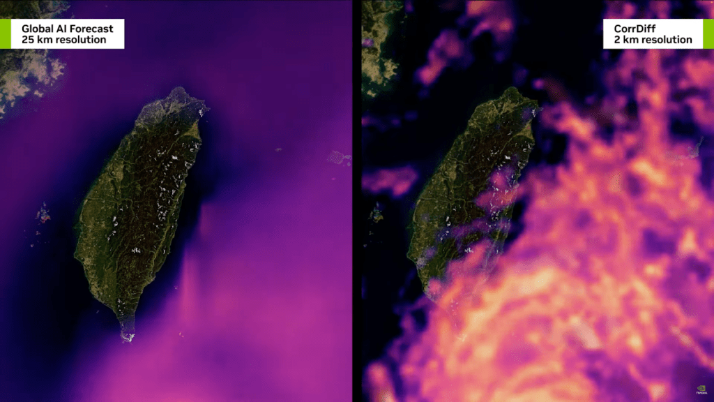 A empresa também afirma que a nova plataforma é 1.000 vezes mais rápida na geração de imagens preditivas do que os modelos atuais e 3 mil vezes mais eficiente em termos de energia, graças a um modelo generativo de IA chamado CorrDiff.