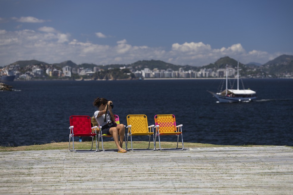 Na foto,a artesã Maria Luiza Lyra fotografa as cadeiras que produziu na Prainha da Glória — Foto: Márcia Foletto