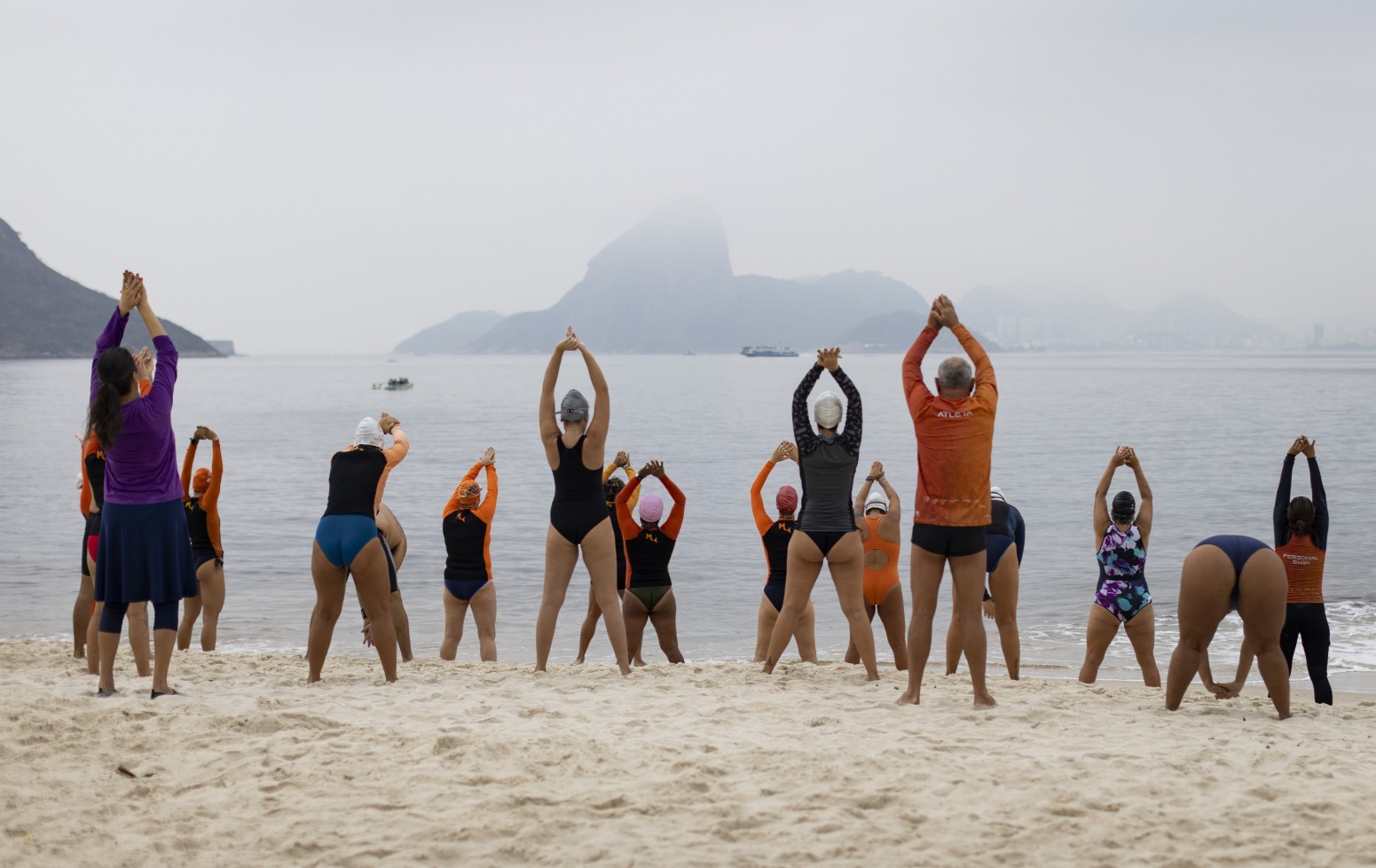 De manhã cedinho,alunos da escola de natação Mar Adentro se preparam para nadar na praia de Icaraí — Foto: Márcia Foletto/Agência O Globo