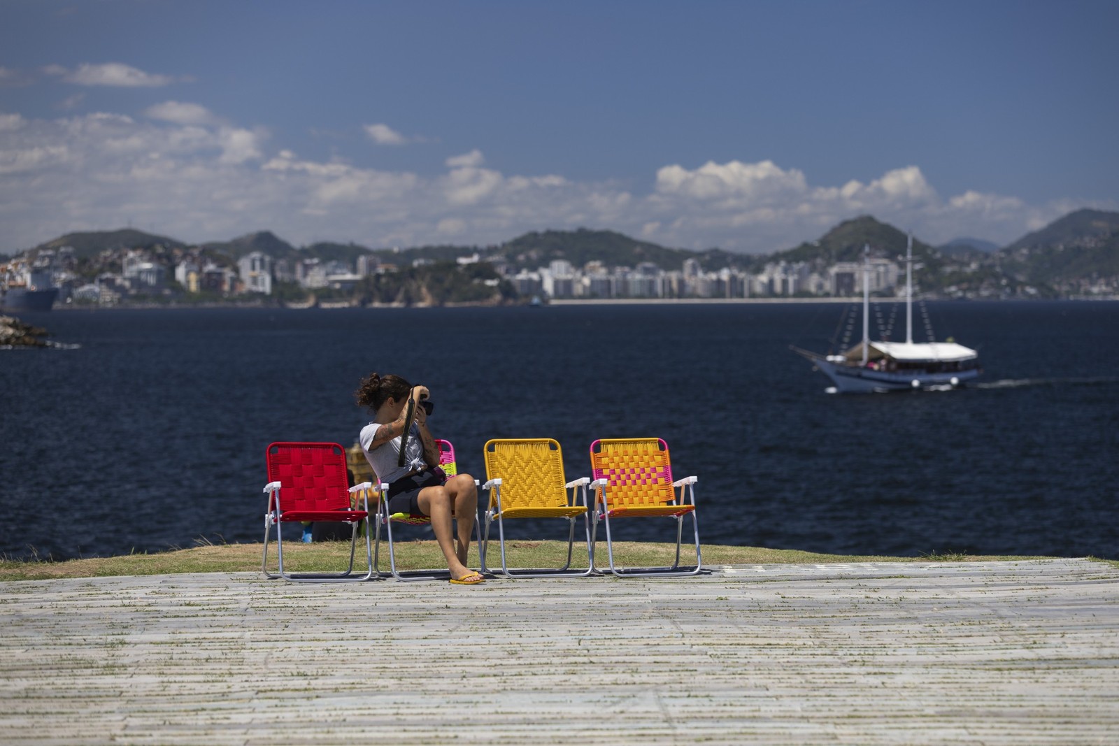 A artesã Maria Luiza Lyra fotografa,na Prainha da Glória,as cadeiras que produziu — Foto: Márcia Foletto/Agência O Globo