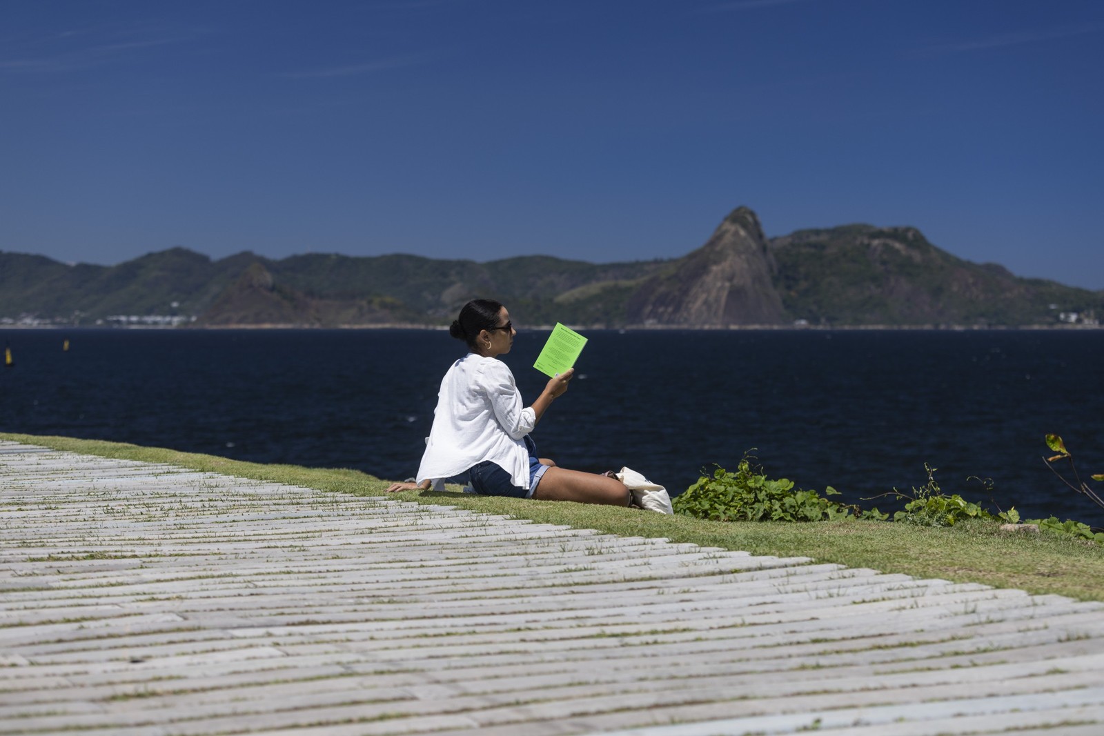 Mar e tranquilidade: uma moradora aproveita para ler no sol na Prainha da Glória — Foto: Márcia Foletto/Agência O Globo