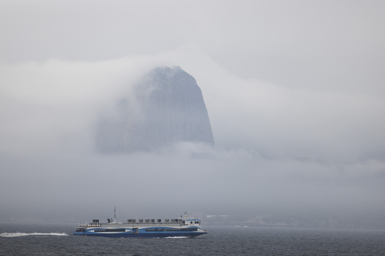 Catamarã atravessa a Baía em dia de névoa; local vai receber campeonato de vela Sail GP em maio de 2025 — Foto: Márcia Foletto/Agência O Globo